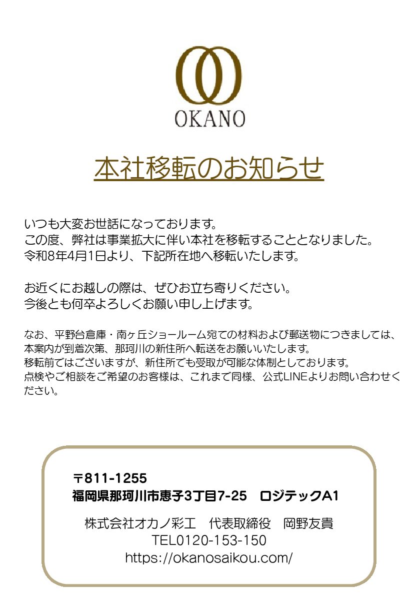 💁本社移転のお知らせ___. 2026年03月18日(水) こんにちは ⁑*⋆福岡 外壁塗装 水回り 地域最安値に挑戦中!!!!!!!!!!⋆*⁑ 大野城市・筑紫野市・太宰府市・春日市・那珂川市・福岡市の皆様 塗装と水回りの専門店 株式会社オカノ彩工です。 いつもスタッフブログを・・・