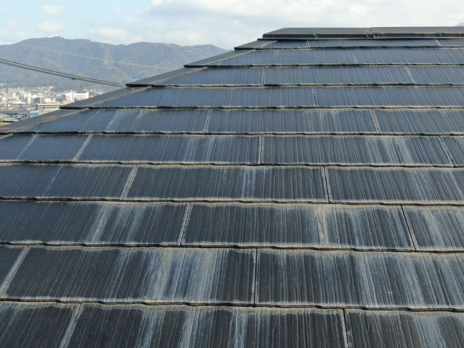 屋根全体に紫外線劣化による塗膜剥離が見受けられました。