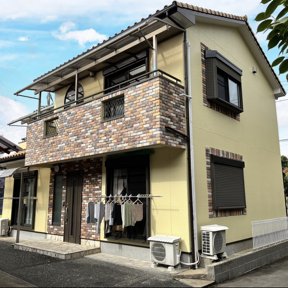 優しいレモンカラーの外壁にレンガが際立ってとてもカッコ良く仕上がりました❕❕