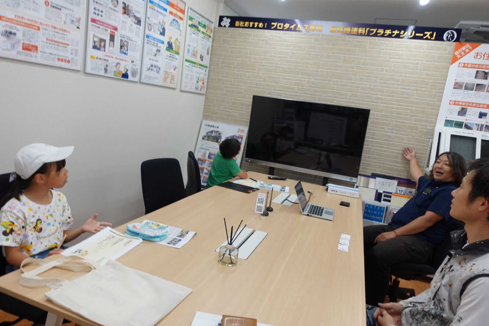 ショールーム内の商談スペースで“外壁塗装とは?”を少しお勉強💭