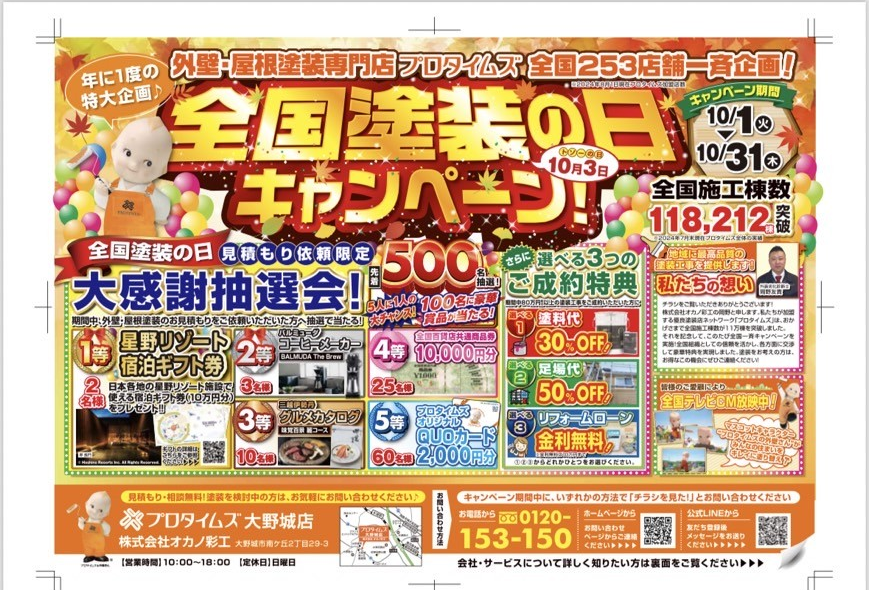「プロタイムズ」は、おかげさまで全国施工棟数11万棟を突破しました。それを記念して、このたび全国一斉キャンペーンを実施いたします。全国組織としての信頼を生かし、各方面に交渉して豪華特典を実現しました。塗装をお考えの方は、お得なこの機会にぜひご連絡ください。