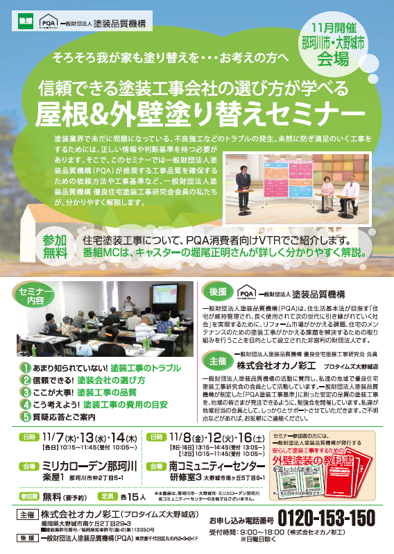 11月開催🎈那珂川市・大野城市会場『屋根・外壁塗り替えセミナー』筑紫野・太宰府・春日にお住みの方もぜひご参加ください😊