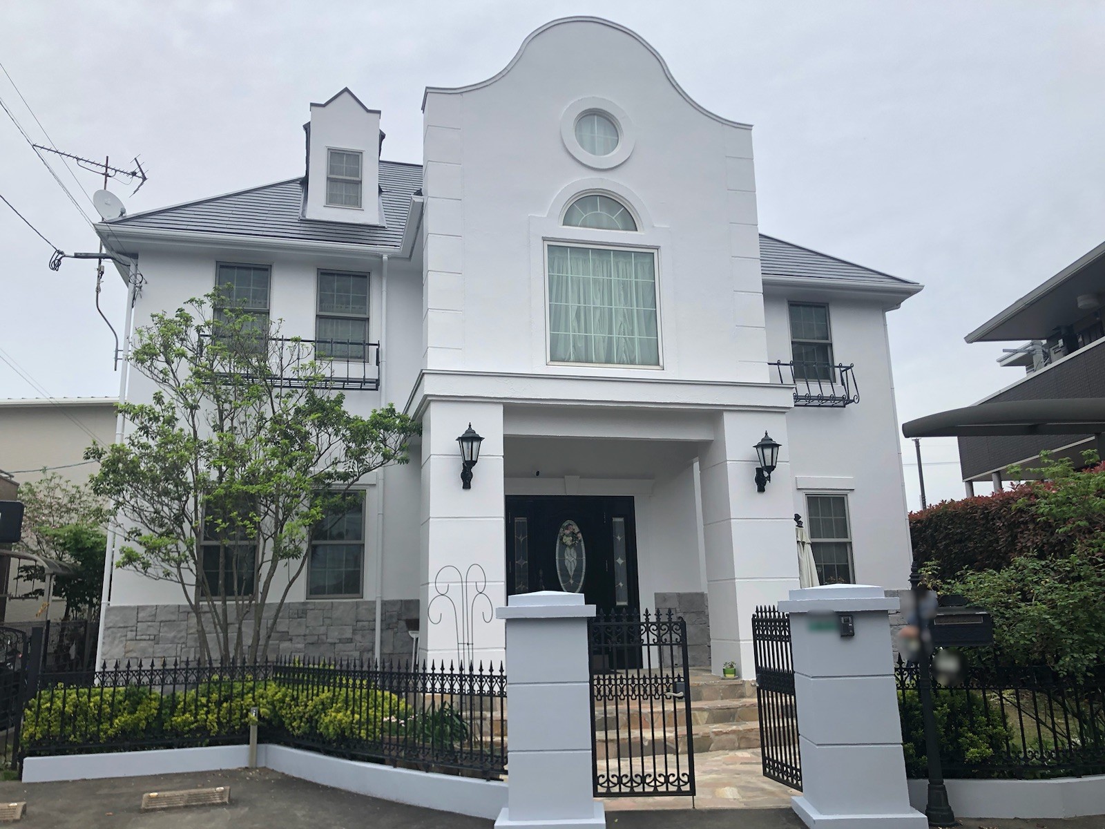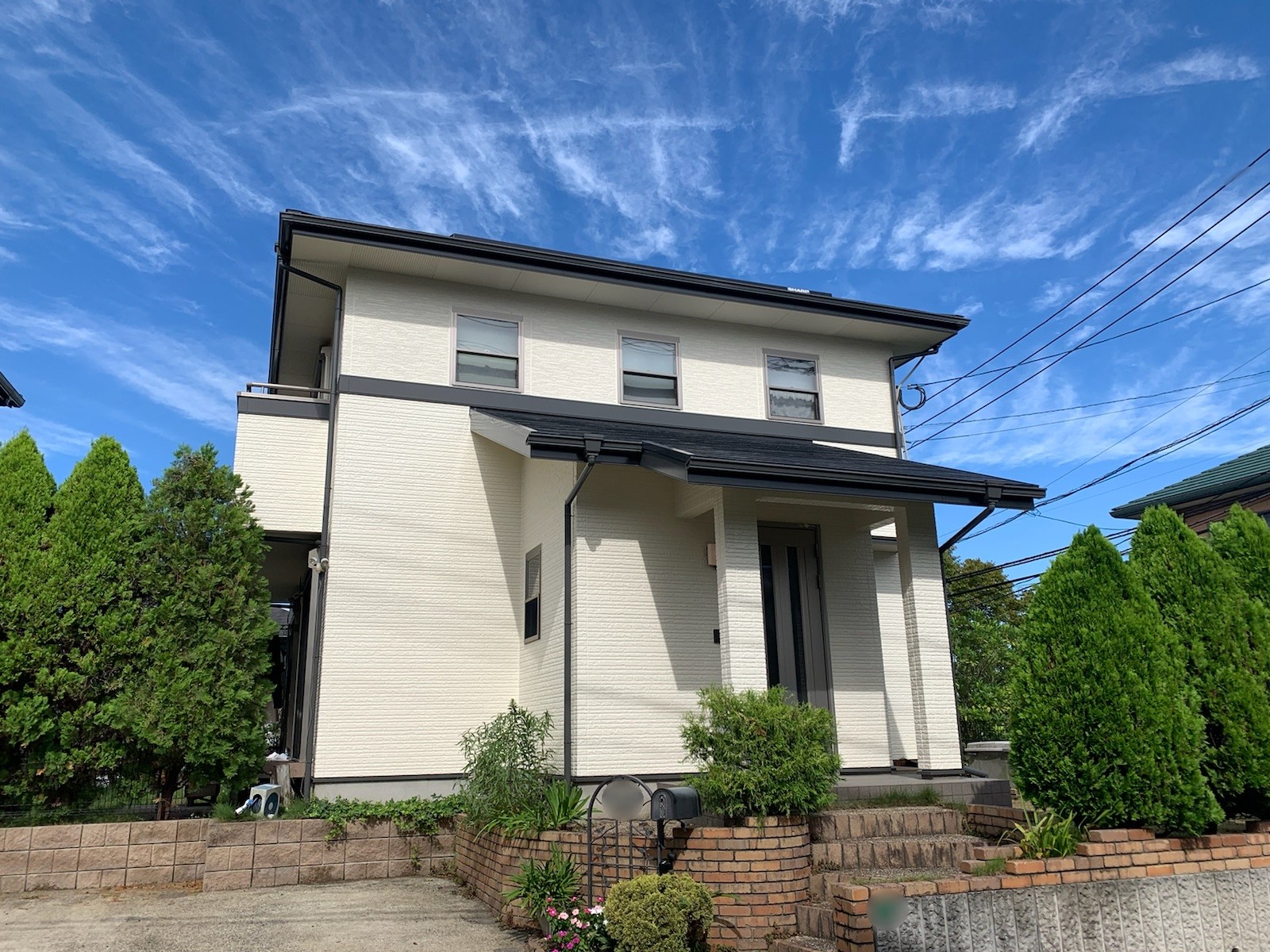 こちらも洋風の家の外壁全体を白系に塗った事例です。こちらはサッシの色も白系ですので外壁面は全体的に白色ですが、下屋屋根(1階屋根)が下からもよく見えますので、その屋根の色を濃色にして見た目にメリハリを付けています。また、玄関ドアの色も濃色でほど良いアクセントになっています。