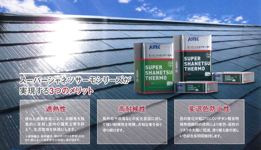 スーパーシャネツサーモシリーズは、株式会社アステックペイントによって開発された塗料です。屋根塗装で使うと、次のようなメリットがあります。