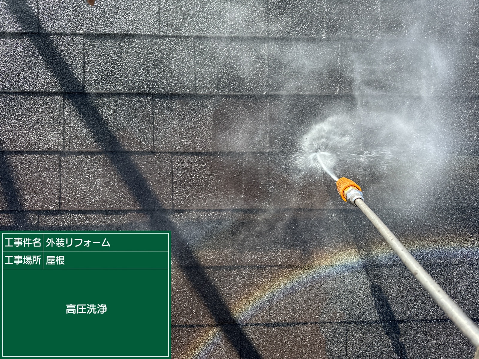 目安としては、洗浄機1つで1人作業の場合、外壁と屋根を合わせて8時間前後です。