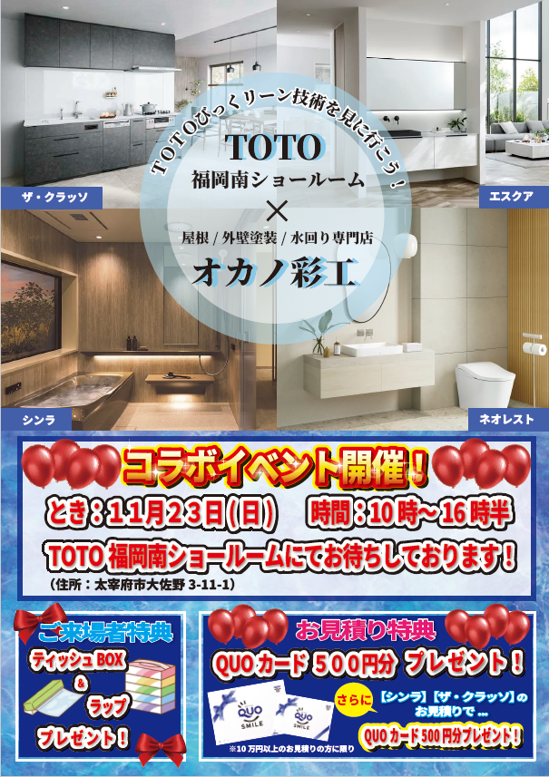 【福岡 外壁塗装】11/23㈰の1日限定‼️TOTO×オカノ彩工 コラボイベント開催!🌈