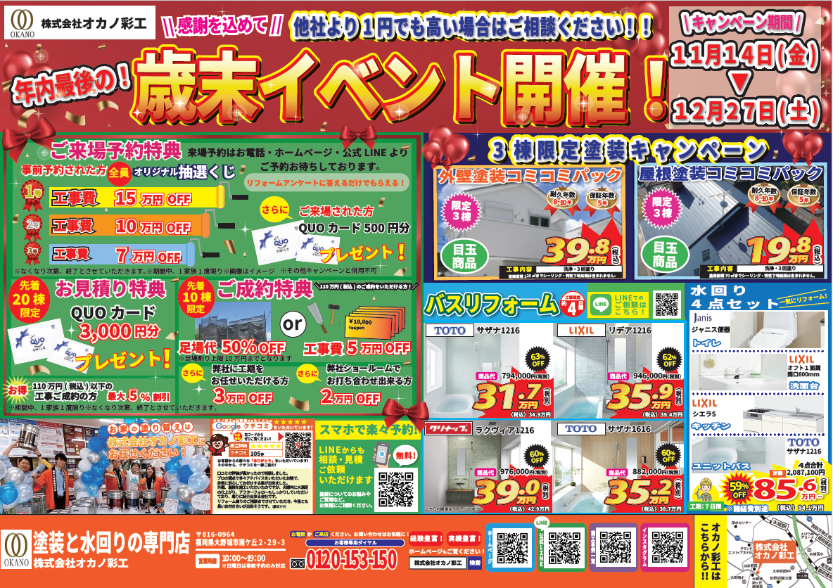 【福岡 外壁塗装】年内最後の!⛄歳末塗装イベント「残り7日間!」事前予約でQUOカード500円分がもらえる最終チャンス💫0円でできる『外壁・屋根診断』受付中です🔔
