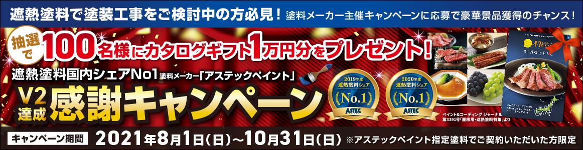このキャンペーンは、アステックペイントが『遮熱塗料で国内シェア日本一を2年連続で獲得した』ことを記念して、開催されているキャンペーンです👏