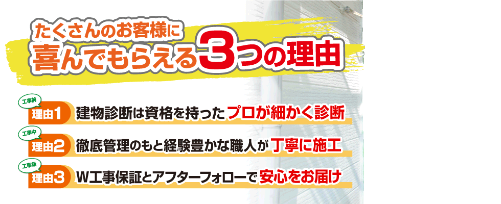 塗装の方法は、建物の素材や劣化状況によって変わるため、有資格者による詳細な診断が欠かせません。見積もり作成のための簡易的な診断ではなく、お家を長持ちさせるための建物診断として、資格を有する外装劣化診断士が2時間以上かけて住まいを隅々までチェックします。
